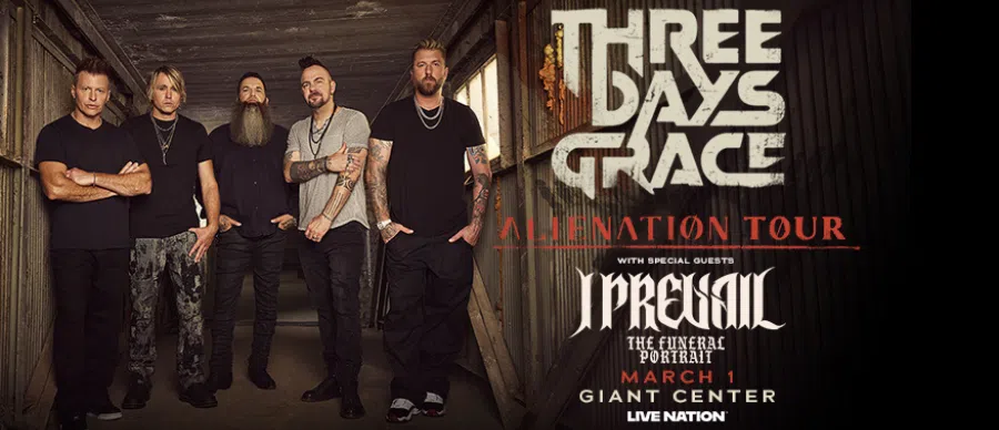 Rock giants Three Days Grace today announced their 2026 Alienation tour will stop at GIANT Center on Sunday, March 1, 2026, at 7 p.m. with support from I Prevail and The Funeral Portrait.